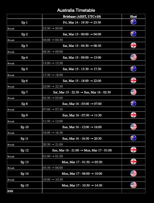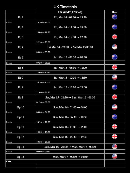 Our timetable covers the whole event but has been broken down into time zones which we hope will reduce confusion.