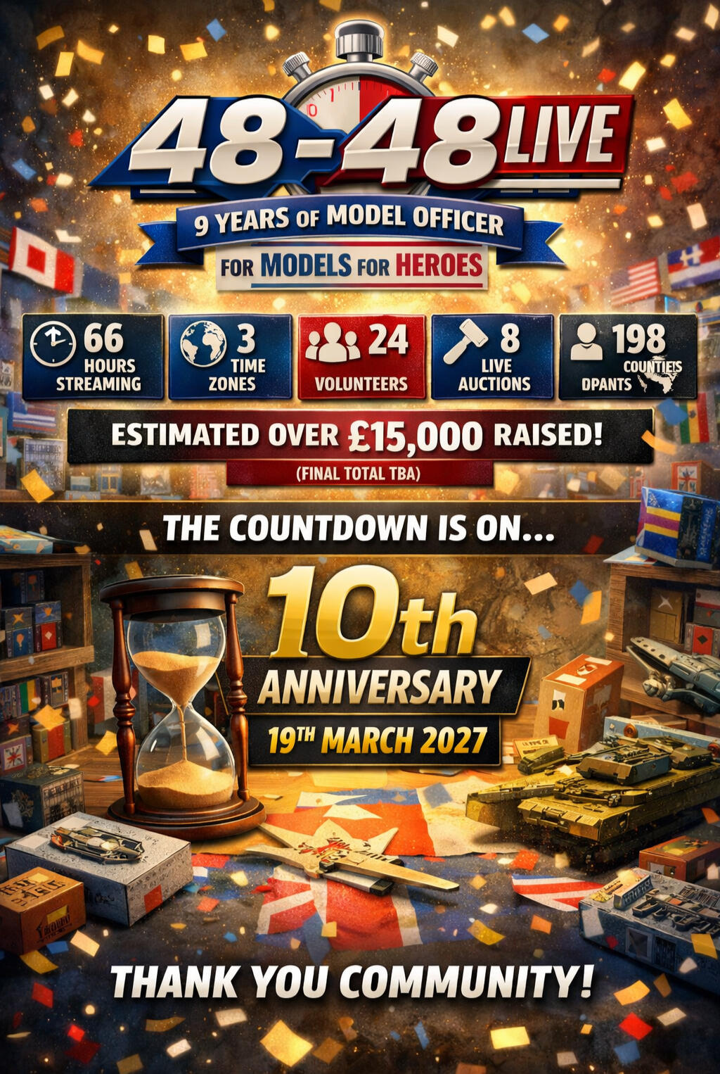 Welcome to the 48 in 48 Challenge—a dynamic and inclusive group build event that combines the joy of scale modeling with the mission to support mental health and well-being through creativity. This annual challenge invites participants to build a 1/48 scale model kit within 48 hours, all in support of Models for Heroes, a UK-based charity providing scale model kits and creative outlets to improve the mental health of veterans, active service members, and first responders.The Origin of 48 in 48